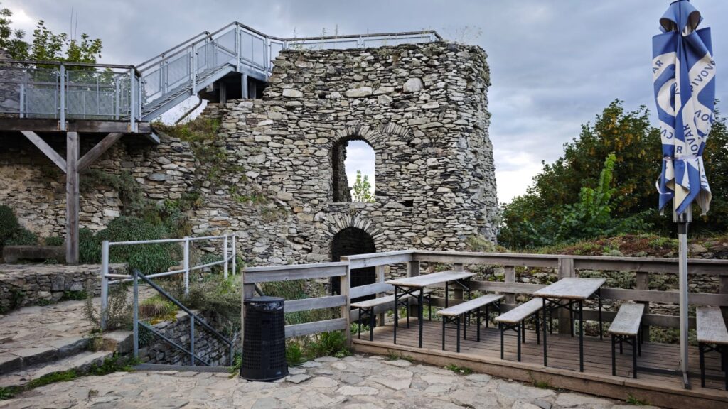 Uprostřed zříceniny stojí dřevěná chata s restaurací a několika pokoji. Postavena byla v roce 1865, rekonstruována roku 2002. Procházíme po historické dřevěné podlaze, z okna je nádherný výhled na Lužické hory. K dispozici je i společná kuchyňka a sprcha se záchodem – téměř luxus.