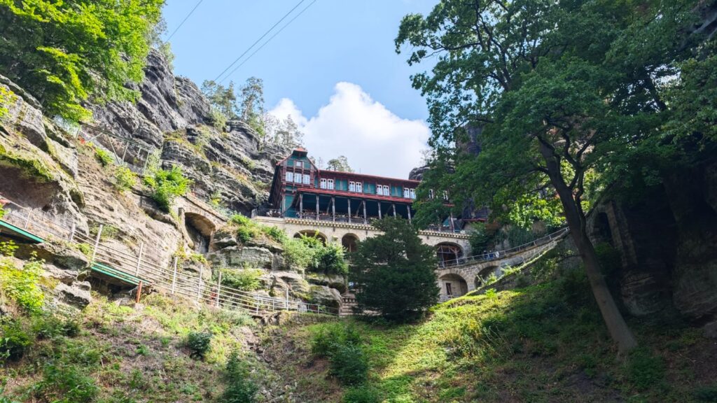 Na Pravčickou bránu dorážíme včas, je tam ještě celkem volno. Sedíme u stolu a popíjíme pivo. Pak se škrábeme nad bránu na vyhlídku – s těžkými bágly je to tedy žůžo! Kvůli sesuvům skal a padání stromů ale nemůžeme pokračovat dál, Gabrielina stezka je uzavřena. Musíme se vrátit dolů a pak teprve navázat na jinou cestu.