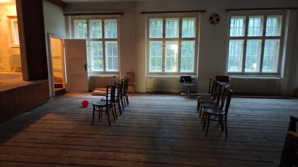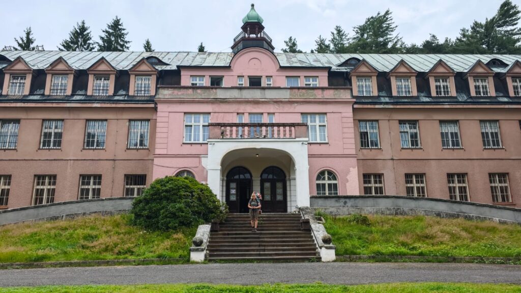 Uvnitř to vypadá jako v zakletém zámku. Jsem vděčná, že si to tu mohu prohlédnout – málokdo se sem normálně dostane. Místo má své kouzlo, svůj genius loci. Nevím, k čemu budova sloužila za druhé světové války, ale na stěnách jsou stále německé nápisy a vývěsky.