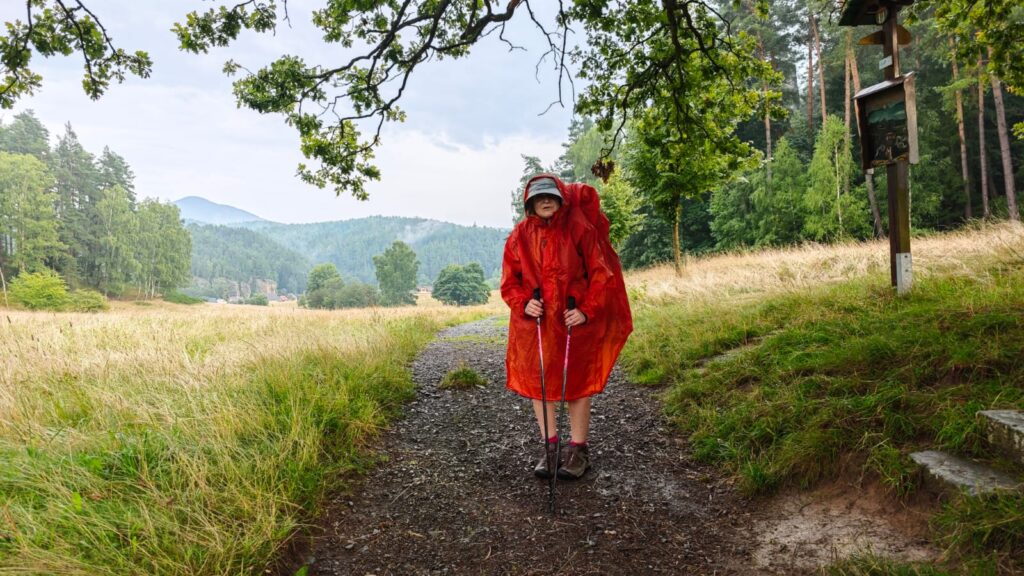 Elova noha se opět zhoršuje. Kulhá. Náplast se prodřela, takže ji přelepujeme novou. Dnešek je opravdu náročný. Do Jetřichovic, cíle dnešní trasy, dorazí El s vypětím všech sil. Jsme promočení na kost, vypadáme jako dva vodníci – voda z nás doslova odkapává.