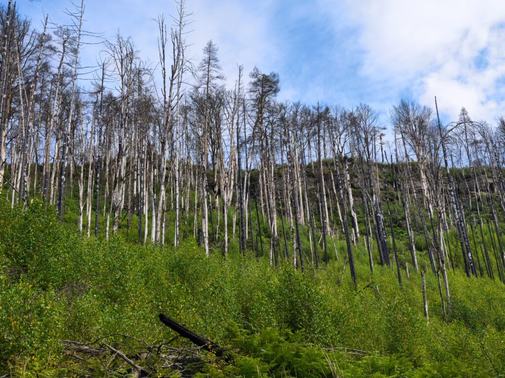 Pod mrtvými kmeny vyrůstají první pionýrské dřeviny – břízy. Ty zalesňují prostor samy a pod nimi se plazí spousta ostružinových keříků. Příroda si umí poradit sama. Vzpomínáme na knihu Tajný život stromů od Petera Wohllebena, kde je mnohé z toho krásně vysvětleno.