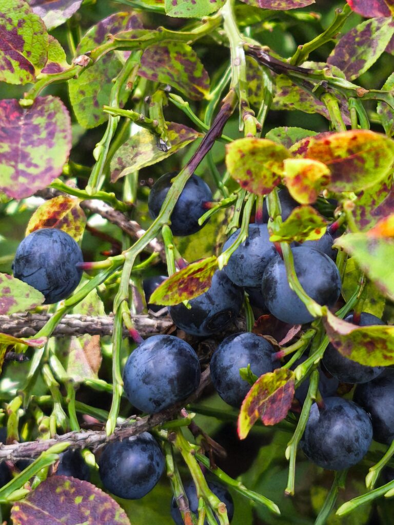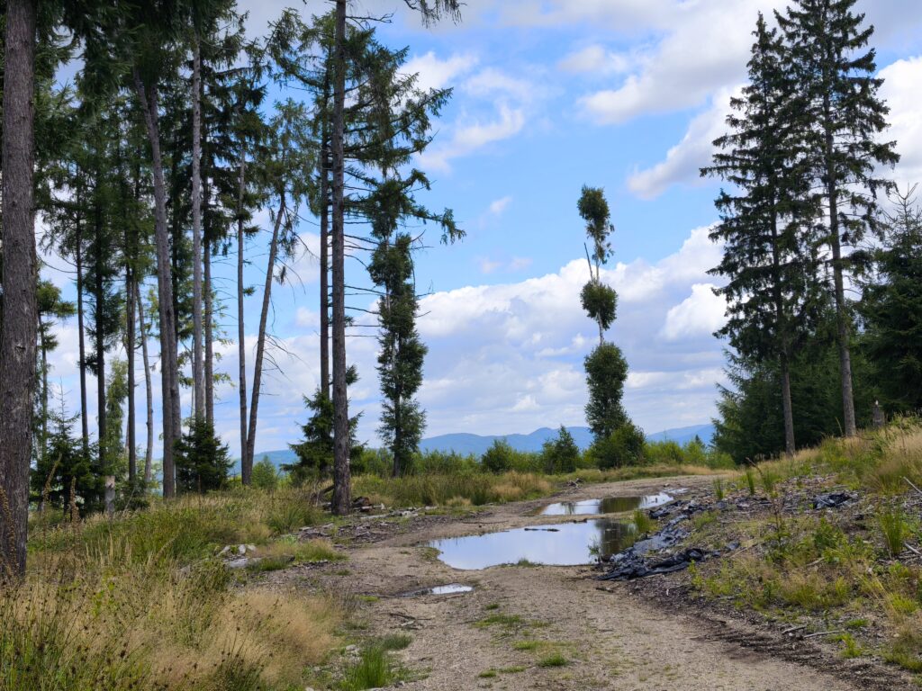 Zastavujeme se u dřevěného přístřešku – tady je doslova ráj borůvek. Žádní turisté tu nechodí, takže jsou jen naše. Tolik borůvek pohromadě jsem snad ještě neviděla. Pokračujeme po hřebeni. Po včerejším dešti se na cestě tvoří nádherné louže, ve kterých se odráží les. Roste tu spousta hub, ale nemáme je jak přenést. V dálce vidíme větrné elektrárny a jadernou elektrárnu Turów.
