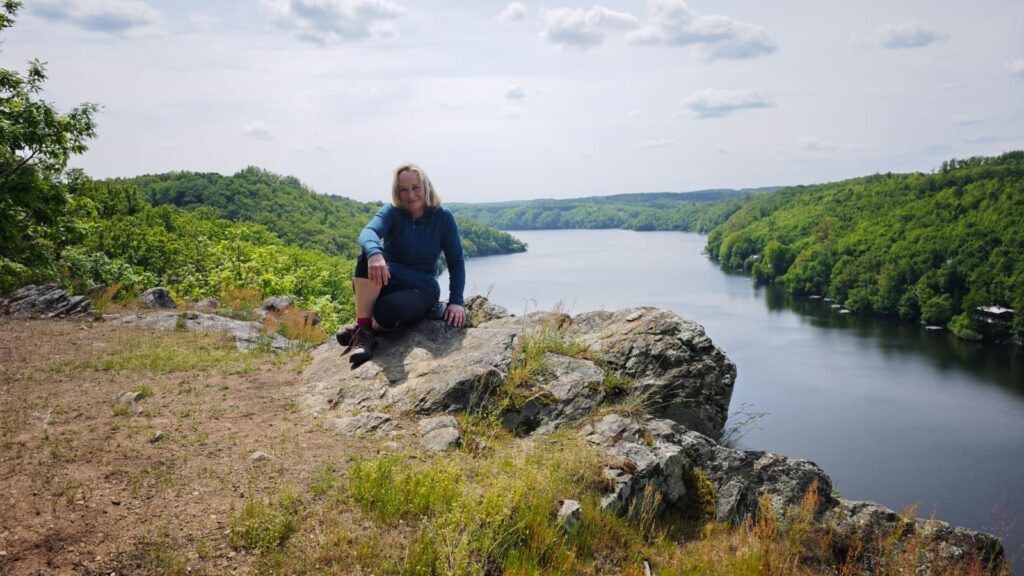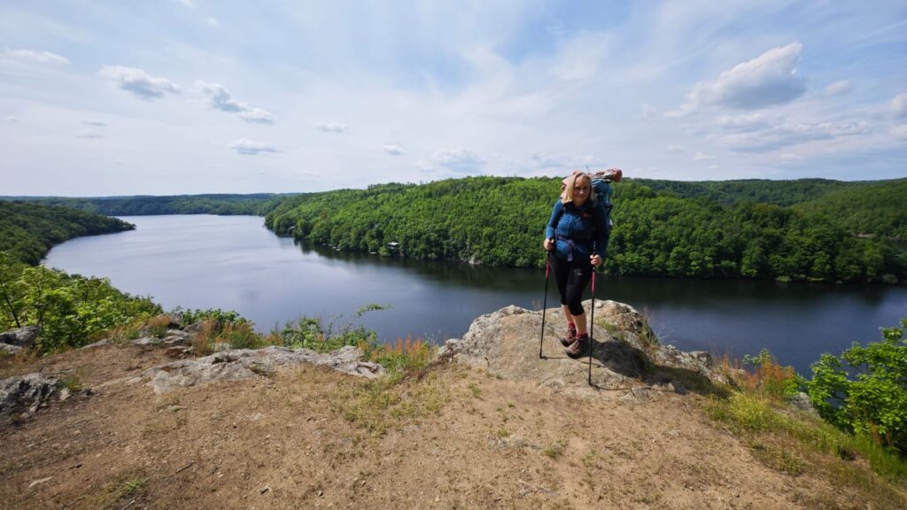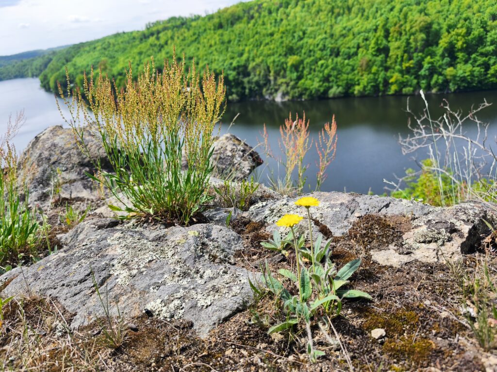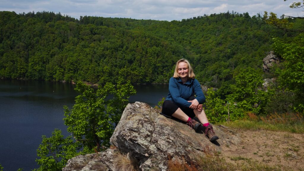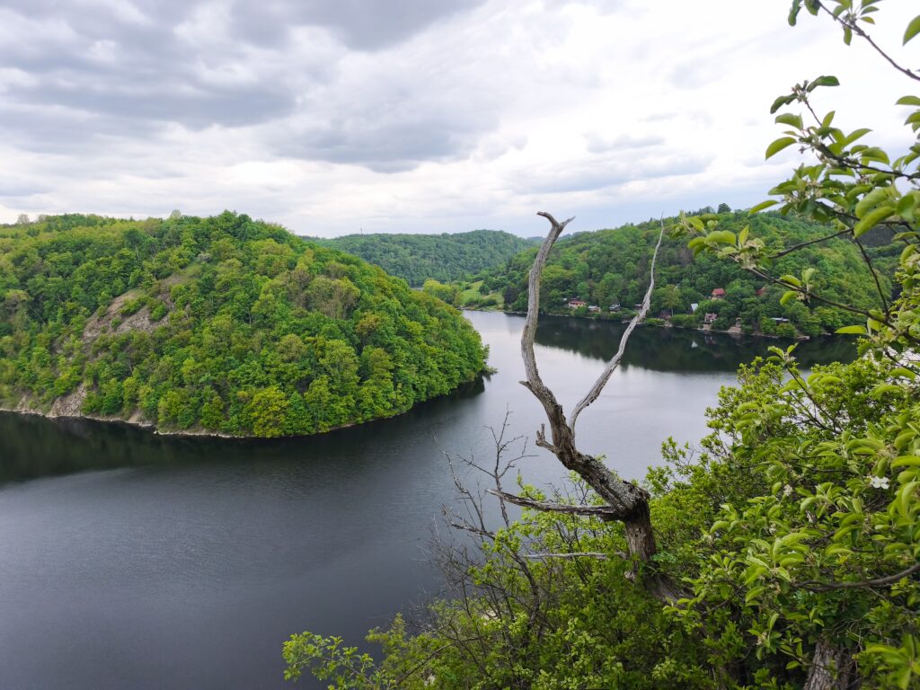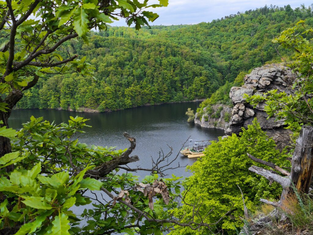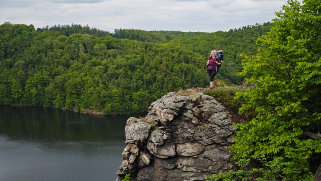 Z trasy trochu odbočíme na Eduardovu vyhlídku. Něco tak nádherného jsme dlouho neviděli. Sedíme na skále, pod námi 30 m sráz do přehrady, výhled na krásný kousek přehrady. Nádhera, úplná nirvana. Jen my, kukačka, strakapoud a ještě jiný pták, kterého neidentifikujem. Mám v telefonu aplikaci na rozpozávání hlasu ptáků. Později zjišťujeme, že ten neidentifikovatelný pták byla žluna. A opět je to tu čistě jen pro nás. Neuvěřitelný klid. Šunka s eidamem na tomhle místě chutná víc jak oběd v luxusní restauraci.