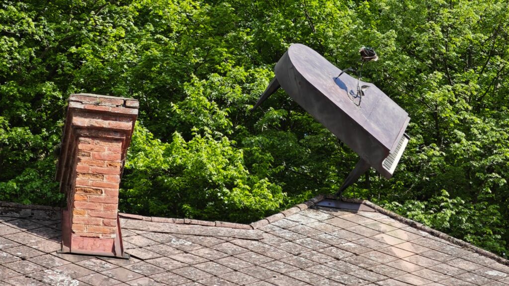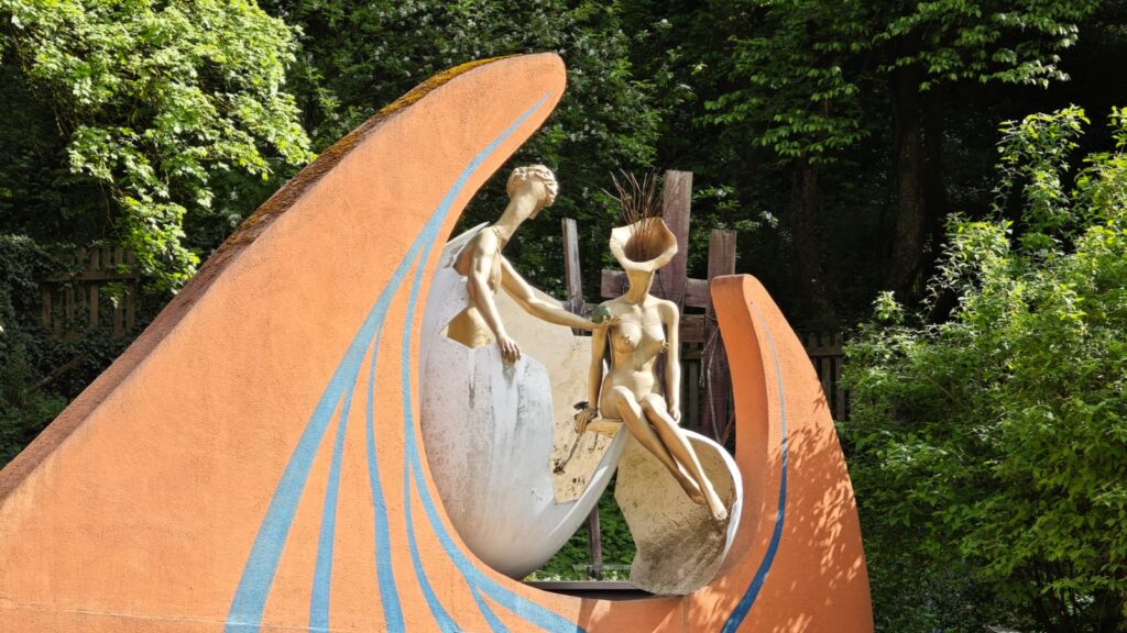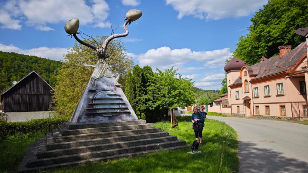 Přicházíme do Podhradí nad Dyjí. Za řekou je podivný dům, na jehož střeše balancuje na jedné noze klavír. Co tam dělá klavír? Zrovna na střeše? Kolem domu jsou pak další sochy – Adam a Eva líhnoucí se z vejce, pyramida s jakýmisi tykadly… Je to dům surrealistického sochaře Lubo Kristka.