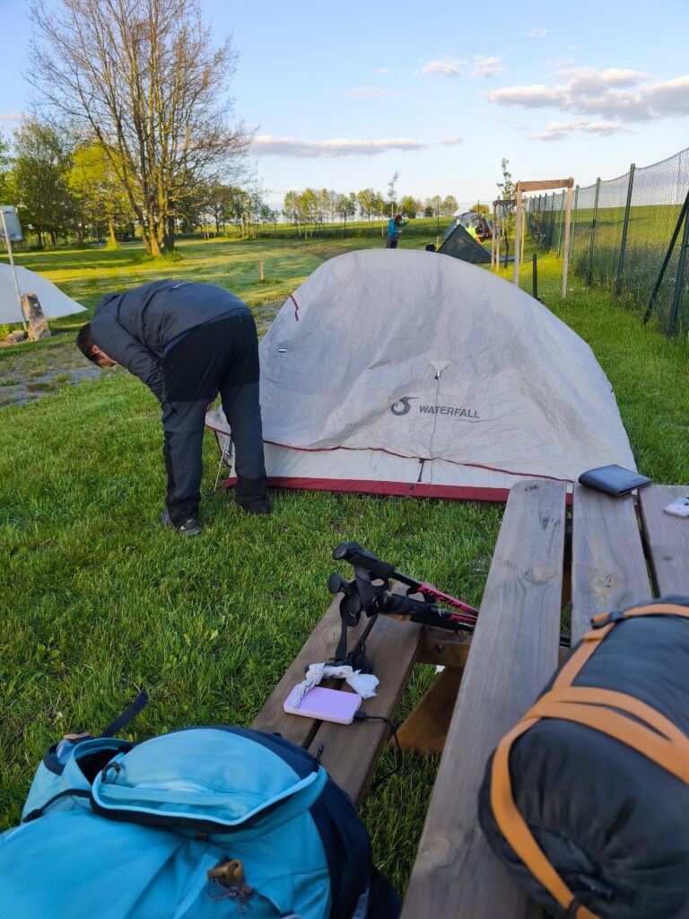Pak už jdeme cestou necestou, lesem, nelesem, nahoru a dolů a míříme do Vratěnína. Cestou potkáváme naši sousedku z chatky, mladý pár, který spal v Bítově pod celtou, rodinku s dvěma puberťáky a psem a dva muže s border kolií. Budeme se pak ještě potkávat a míjet často. Ve Vratěníně se dostáváme do kempu Velo přímo na hranicích s Rakouskem. Provozují ho manželé, kteří jej přestavěli z bývalého areálu pohraničního vojska. Tento kemp je dnešní třešnička na dortu. Je to moc příjemné místo s nádhernou atmosférou. Ptáme se, kde bude ráno vycházet slunce a předpokládáme, že nám jeho svit prohřeje stan a zachrání nás před zimou. Mají být v noci opět 2 stupně. Přicházíme před západem sluníčka, kemp je úplně prozářený. Stavíme stan. Je to hrozná sranda. El se trochu zamotá a zjišťuje, že má horní plachtu naruby, ale zvládneme to. Já nafukuji samonafukovací karimatky. Přestože se jmenují samonafukovací, musí se dofouknout ústy.