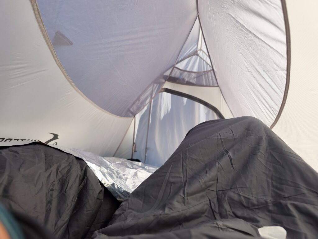 Ještě nás napadlo naplnit si flašky na pití horkou vodou a strčit do spacáku. Pod sebe dáváme izotermickou folii, nad sebe na spacáky druhou folii. Vedle sebe ještě chystáme jednorázové ohřívací polštářky na ruce z Lidlu pro případ potřeby. Je nám vcelku teplo, usínáme.