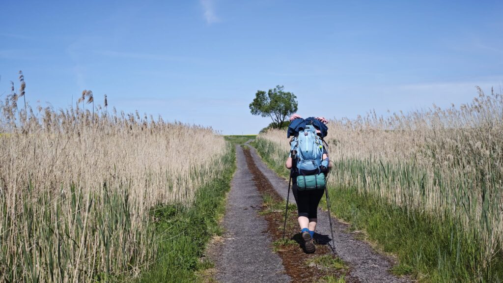 Všechno venku kvete a voní. Vůně jara je úchvatná. Po nějaké době to ale už tak harmonicky nevidíme. Putujeme po staré signálce po hranicích. Není tu jediný strom (asi aby mohli pohraničníci lépe vidět narušitele hranic). 14 km na plném slunci a po rovině je hrozně ubíjející. Chodidla bolí z rovné cesty. El nemá dobrou náladu. Nabízím mu krém na opalování, aby se mu nespálil krk. Nasupeně tvrdí, že nic nepotřebuje. “Budeš mít spálený krk… ” “Ne. Ne a ne…” Po 8 km má spálený krk a dožaduje se krému na opalování.