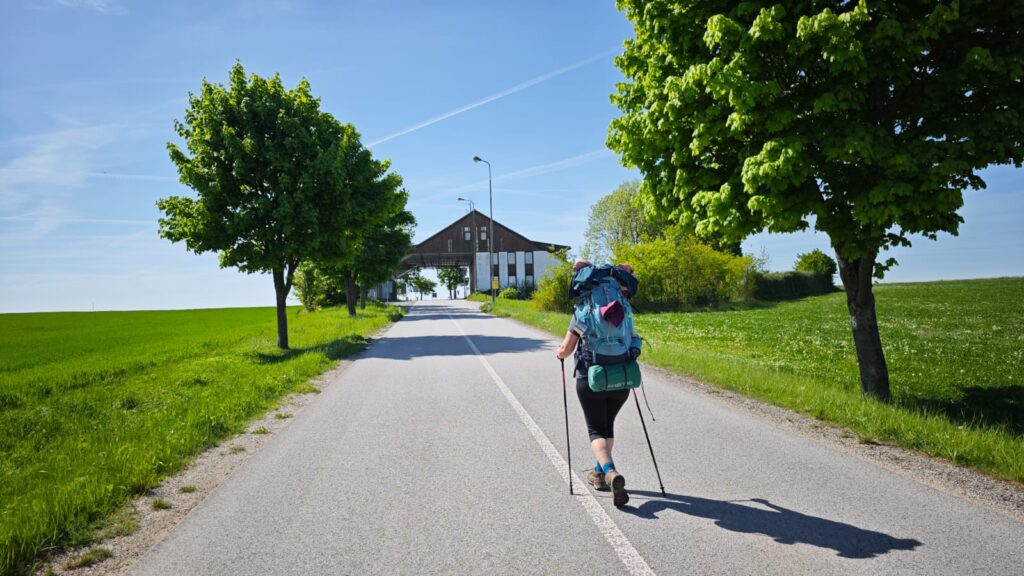 Po 14 km je na cestě alespoň zastřešená bouda s posezením. Jediný stín za celé dnešní putování. Vedle je postavená májka. Ukazuje se, že se jedná o česko-rakouskou májku v rámci družby mezi národy. Májek jsme cestou potkali několik, ale nejhezčí je stejně ta naše – v Radomilově.