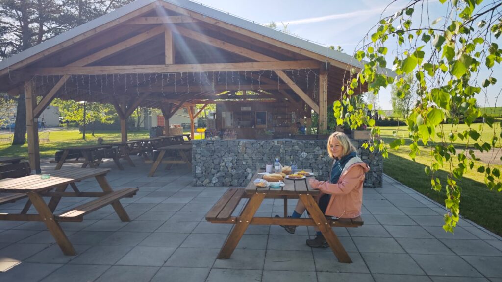 Je nádherné, prosluněné ráno. Majitelka kempu nám udělala k snídani vajíčka a párky. Z rádia nám k tomu hrála píseň Breakfast in Tiffany. Fakt stylové. Prostě luxus. Pomalu sušíme mokrý stan, termofolie, ručníky a balíme se. Je nám dobře. Dnes nás čeká 26,5 km do Slavonic. Ale večer budeme spát v penzionu.