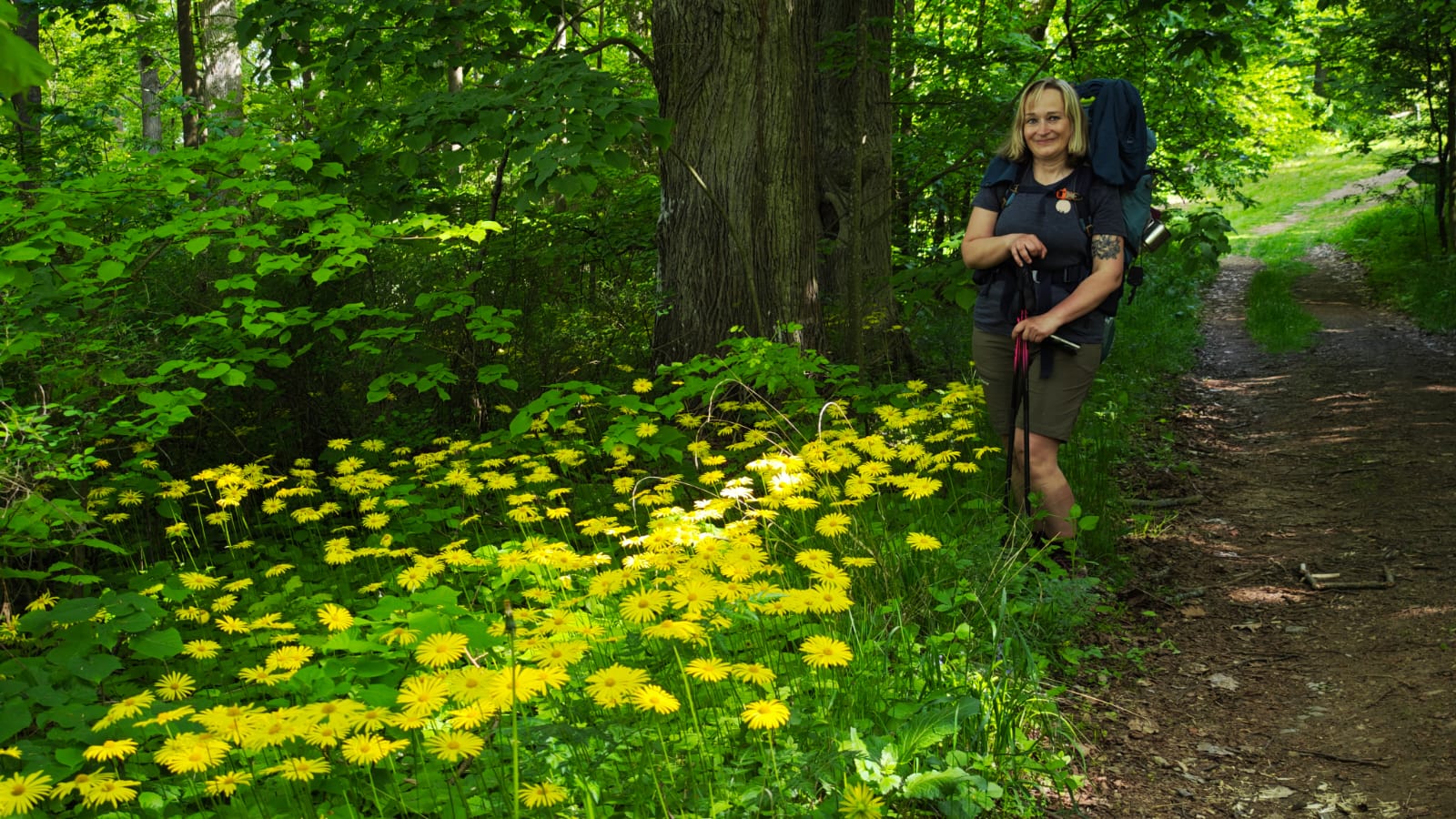 Vystupujeme na kopec, kde je nádherný poutní kostel v lese – Montserrat (neboli kostel Panny Marie Montserratské). Kostel je zavřený, ale vevnitř je prý kopie sochy Černé Madony z Monserratu, která byla přivezena ze Španělska. Skrz mříže ji z dálky vidíme. Je to magické, krásné a silné místo s výhledem do dálky. A i na tomhle místě jsme zase úplně sami, protože nikdo není takový blázen jako my, aby chodil v neděli ráno na výlet.