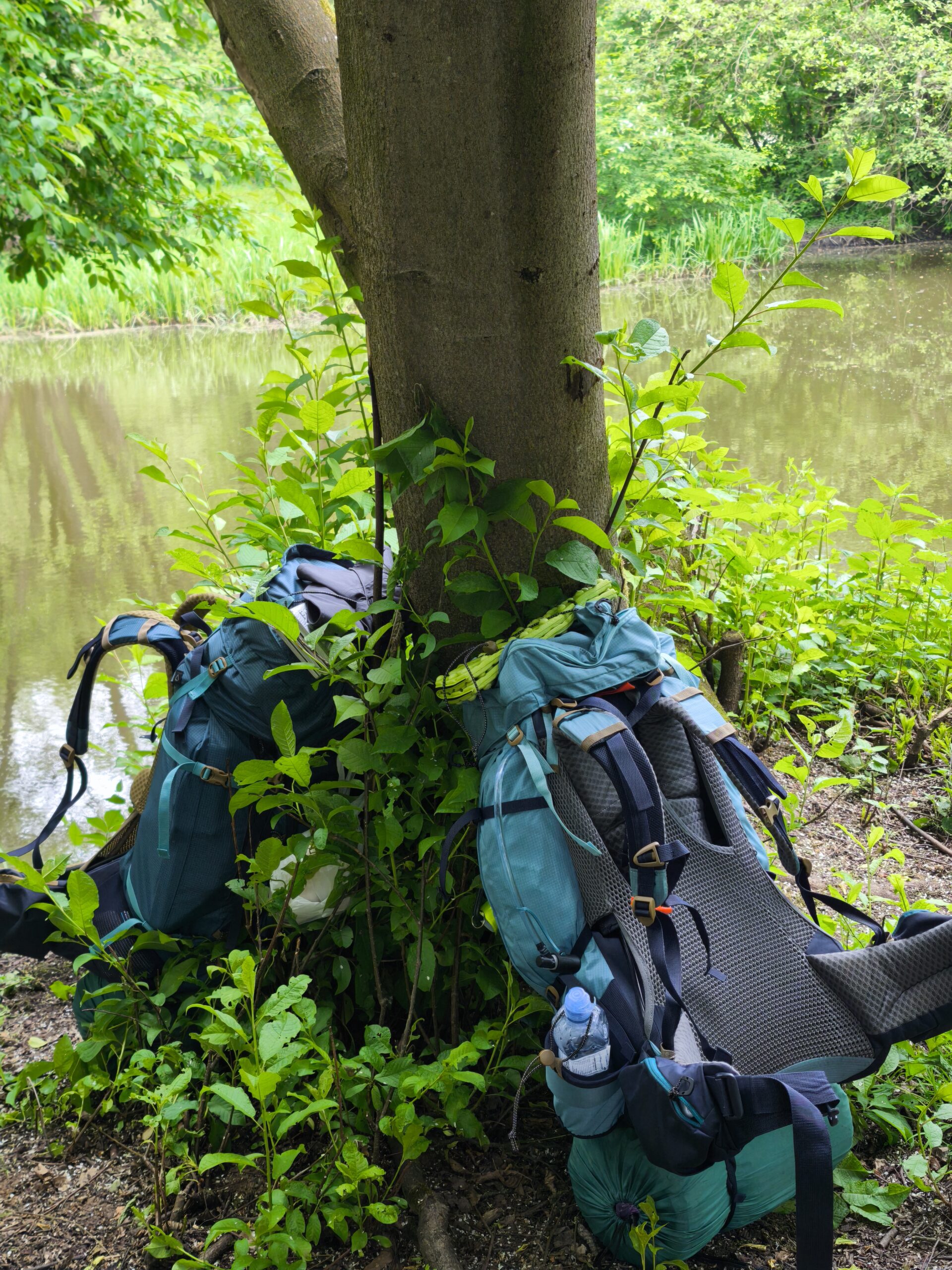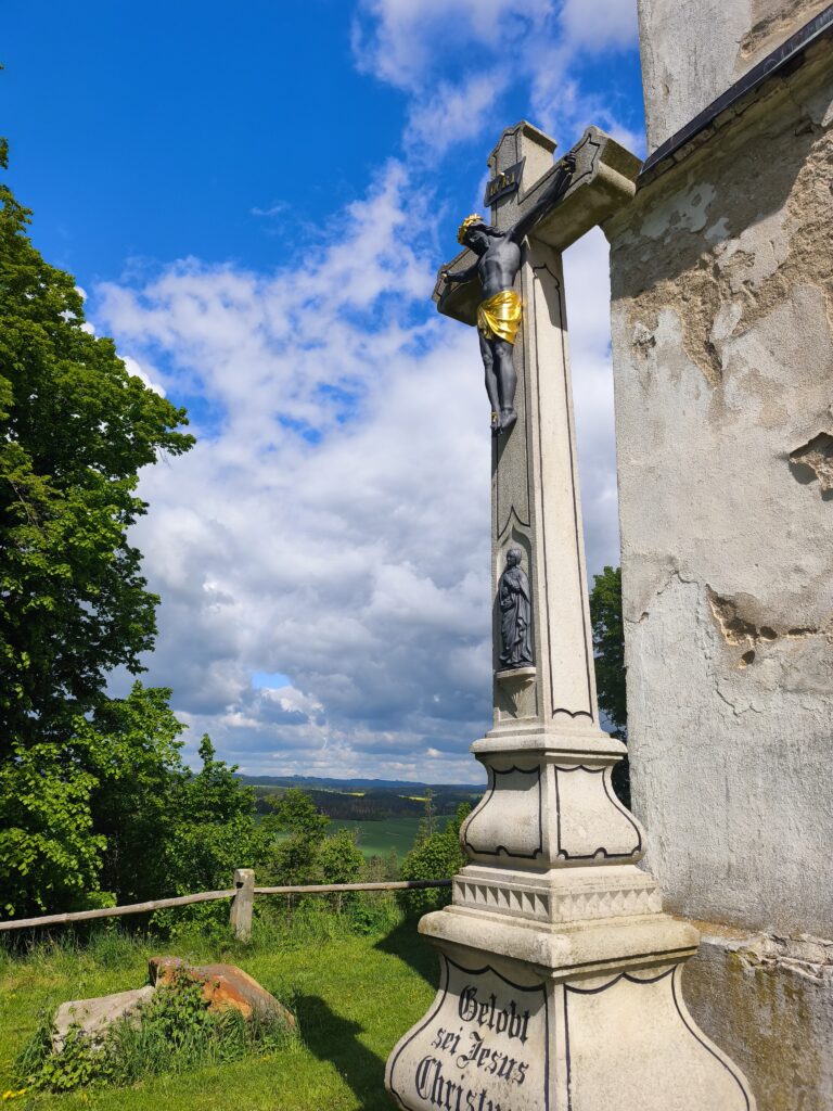 Po několika kilometrech přicházíme do vesnice Hradištko s rybníkem uprostřed. Sedíme pod lípou u kamenného křížku, protože nám zatelefonoval syn. Jsou u nás doma tři (všichni okolo 20 let). Udělala jsem jim zásoby jídla do lednice a předem řekla instrukce, jak si uvařit jídlo ze zásob z mrazáku. Ukázalo se, že měli 6x lečo, nevšimli si, že je v lednici ještě guláš a když jim lečo došlo, nechali si přivézt jidlo z restaurace.