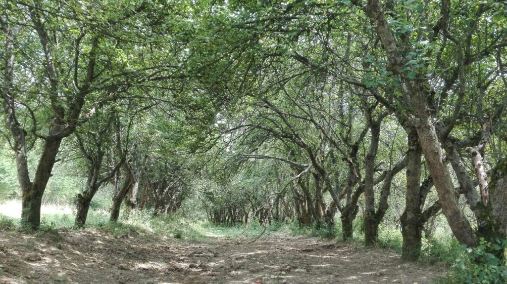 Jdeme kousek podél silnice směrem od hranic k České republice a za chvíli zatočíme doprava, vystupujeme do kopce po úzké asfaltové cestě, ale po chvíli se již vydáváme po úbočí kopce po cestě polní. Kolem je spousty keřů – trnky, kaliny, bezu chebdí … Pak přicházíme ke velkému, starému, asi opuštěnému jabloňovému sadu. Vypadá trochu strašidelně. Stromy jsou velmi staré, větve tlusté, pokroucené. Jablek ale spousty. Podél stromů spousty ostružinových keřů. Sad je opravdu velmi rozlehlý. Skrz propletené větve není vidět ani na oblohu. Stromy jsou umístěné v řadách, mezi nimi vznikají jakési stromové koridory.