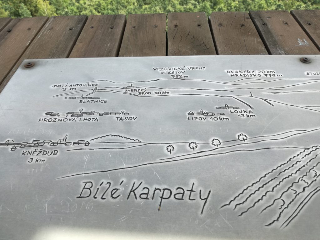 Ještě než jsme se do obasti dostali, podnili jsme na kole výlet do okolí. Dojeli jsme k rozhledně Travičná. Mimochodem rozhleden jsme navštívili mnoho, ale tato byla unikát – poměrně vysoká, celá jen z ocelové konstrukce, nahoru stoupáte po velmi úzkém, točitém schodišti a po levé straně máte řídké zábradlí. Celou dobu vidíte pod sebou i vedle sebe onu obrovskou hloubku. Je to jako byste šplhali na komín. Výšek se většinou nebojím, ale tady jsem opravdu měla jak se říká “sevřený zadek”. Výhledy jsou krásné – na oblast Slovácka, Jižní Moravy a Bílých Karpat.